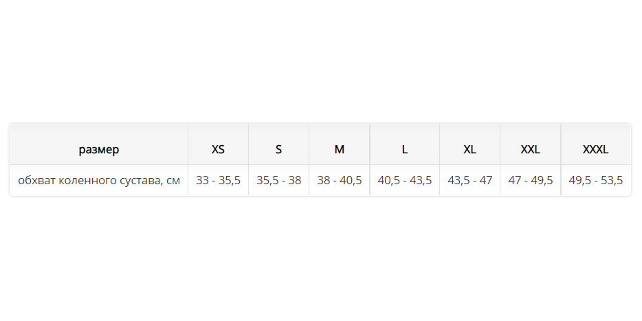обхват коленного сустава, см 33 - 35,5 35,5 - 38 38 - 40,5 40,5 - 43,5 43,5 - 47 47 - 49,5 49,5 - 53,5